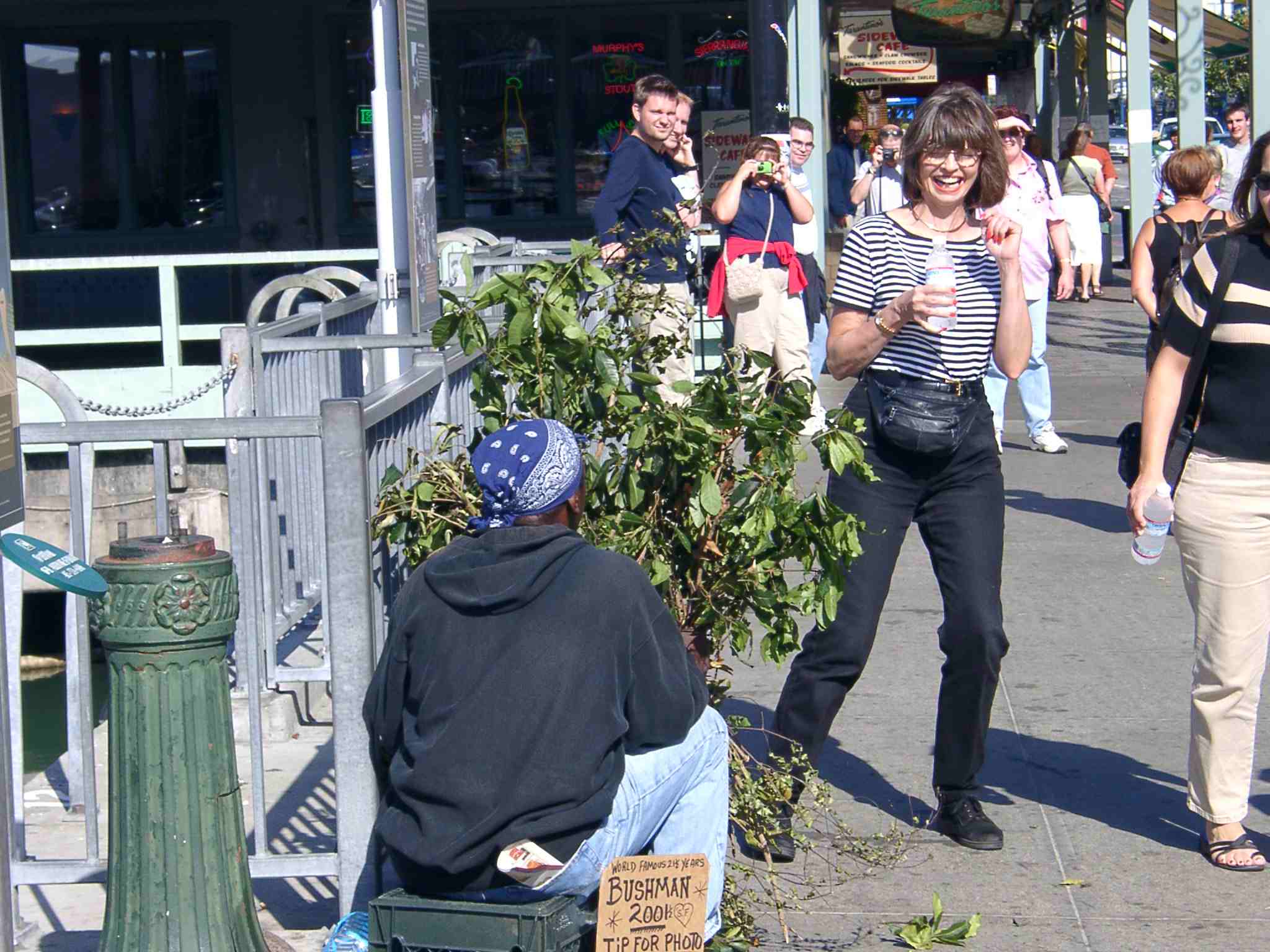 09100020.jpg "The World Famous Bush Man" He hides behind that greenery and scares tourists. Doesn't sound funny, but it is. People are mad at first until they see that lots of people are laughing.
